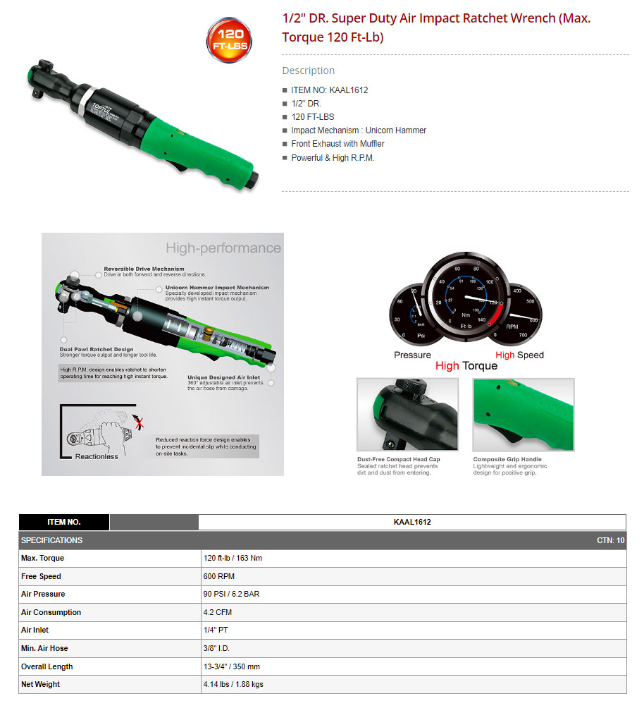 1/2" DR. -Super Duty Air Impact Ratchet Wrench (120 FT-LBS)