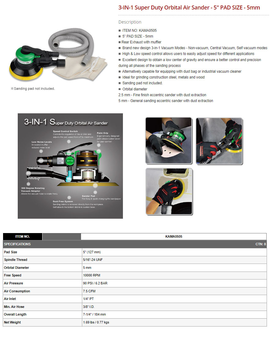 5" PAD SIZE 5mm. (3-IN-1) Super Duty Orbital Air Sander