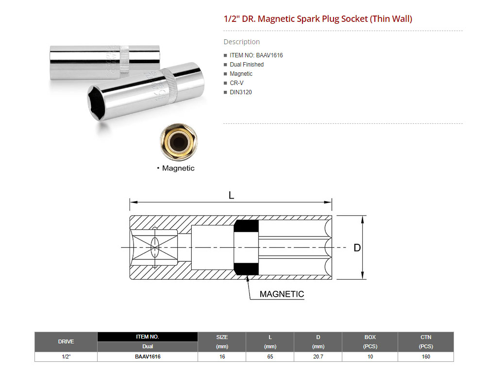 SIZE(16mm) 1/2" DR. Magnetic Spark Plug Socket(Thin Wall)