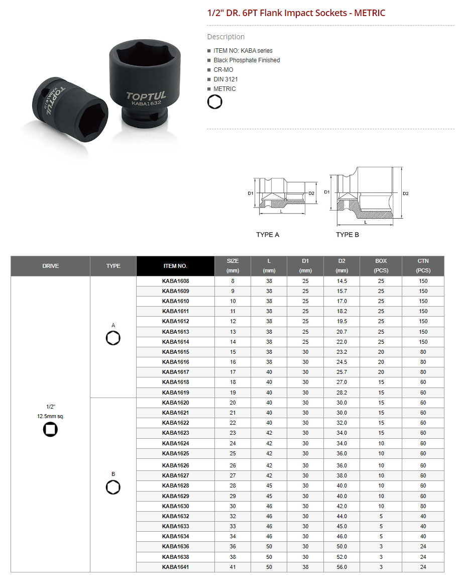 SIZE(mm) 1/2"" -6PT Flank Impact Sockets