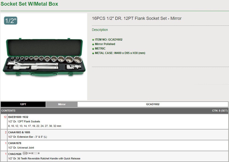 SIZE(mm) 16PCS -1/2" DR. 12PT Flank Socket Set