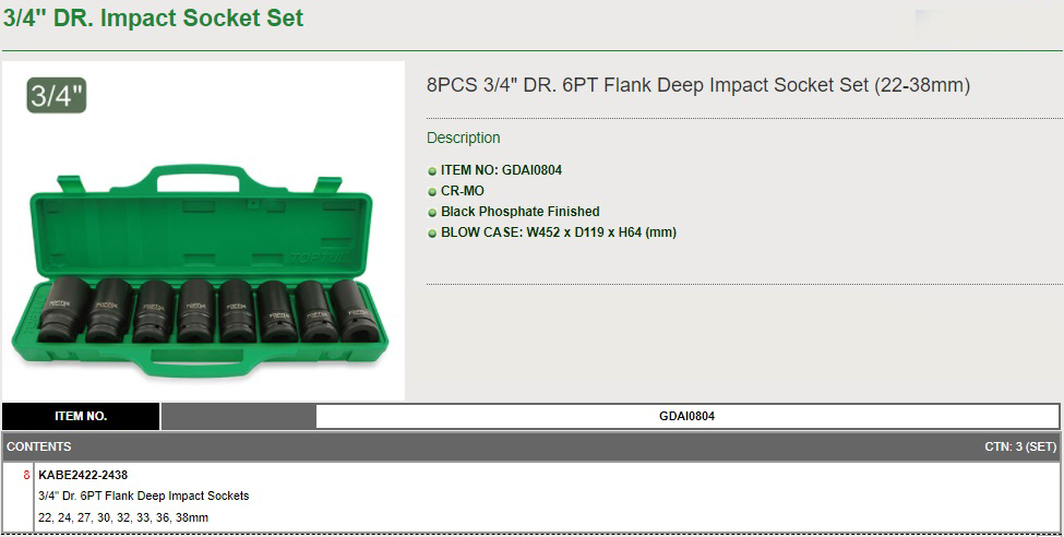 SIZE(mm) 8PCS -3/4" DR. 6PT Flank Deep Impact Socket Set