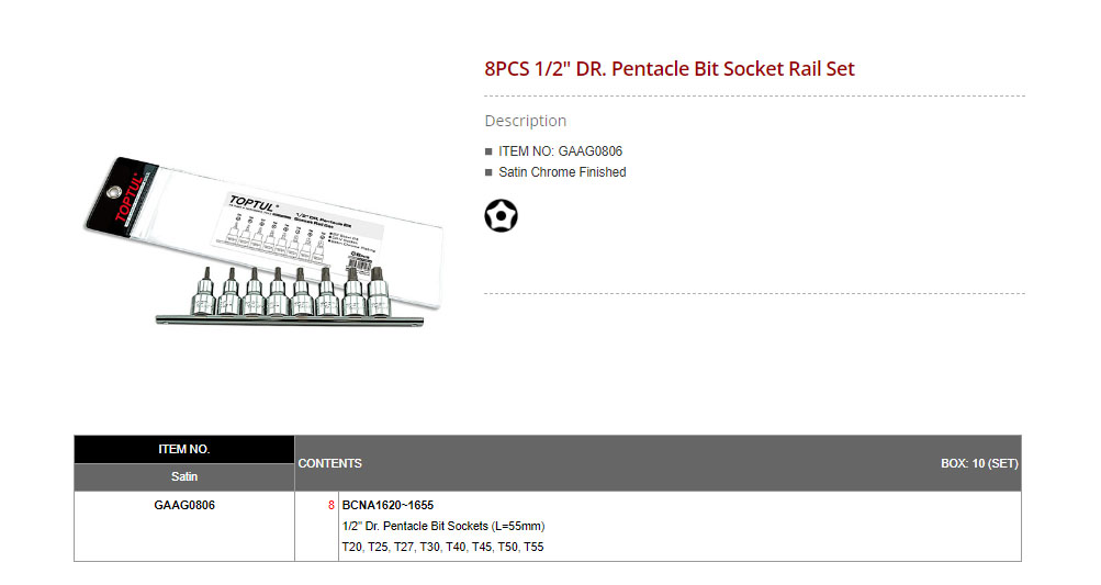 SIZE(T) 8PCS -1/2" DR. Pentacle Bit Socket Rail Set
